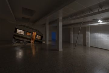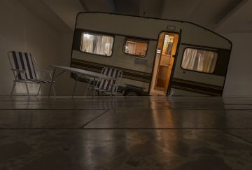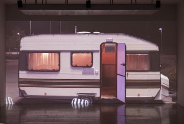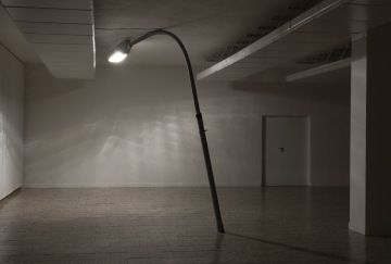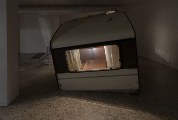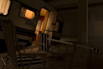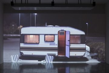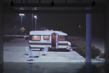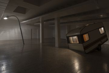 Bretonovskou asociaci jsem nezvolil náhodou. Pomůže nám pochopit, v čem se práce Davida Možného liší od surrealistické hry s nalezenými objekty. Setkání karavanu a pouliční lampy není divné samo o sobě, co na něm tedy tak zneklidňuje? Kromě místa, kde k němu dochází, je to samozřejmě fakt, že se obě dominanty instalace podivně sesouvají, respektive se zdají být postaveny na rovině neidentické s banálně horizontální rovinou podlahy galerie, po které se kolem nich prochází divák. Do hry tak vstupuje nejen racionální vědomí o tom, „jak se věci mají“ (kandelábry a obytné přívěsy patří na ulici, na silnici, do autokempu…), ale také tělesný, před-racionální prožitek.