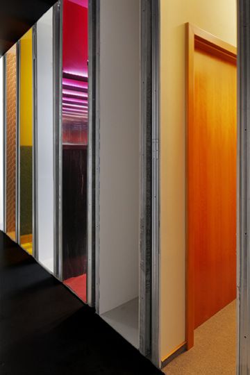 Imagine interiors where opposing walls have slid toward each other, leaving a 41-centimeter-wide cut. It’s hard to move inside, hard to breathe. Each slot is a scene from a film paused on a single frame; in fact, there are no other frames—the preceding and following ones have disappeared or been erased. The viewer is forced to move along the boxes in the same way a film camera glides through walls in a single shot.