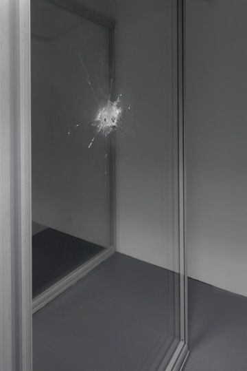 … Průstřel je tím, co nás znejišťuje, co narušuje neutrální minimalismus vnímaného prostředí. Konfrontace s trajektorií střely v transparentním skleněném „labyrintu“ je fyzickou a zároveň existenciální zkušeností. Do úvahy přichází potentialita křehkosti, nedostatku, smrti, ztráty, ale také touhy, k níž nás jaksi zkorumpovaně přivádí dvojznačnost názvu Miss you: Minul jsem tě / Chybíš mi.
