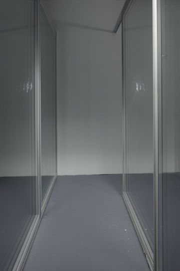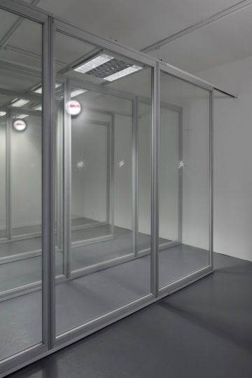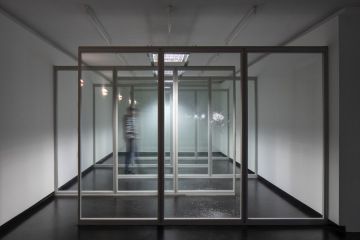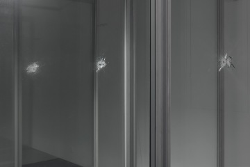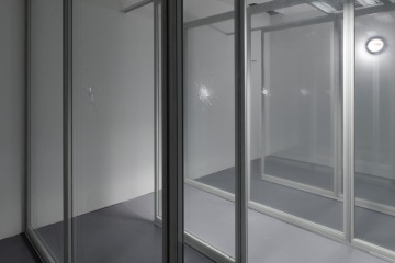 … The shot is what unsettles us, breaking through the neutral minimalism of the perceived environment. The confrontation with the projectile’s trajectory in a transparent glass “labyrinth” becomes both a physical and existential experience. We become aware of the potential for fragility, absence, death, loss — and desire, which we are led to, almost insidiously, by the ambiguity of the phrase Miss you.