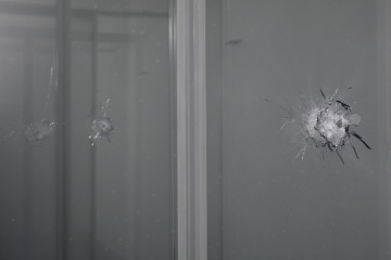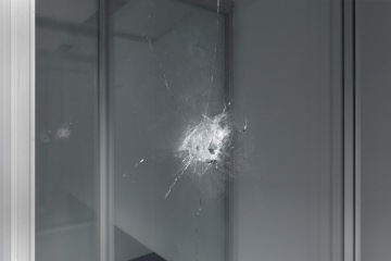 skla v recyklovaných kovových rámech, projektil ráže 9 mm, čidlo pohybu, stropní kancelářská světla, bezpečnostní světlo/