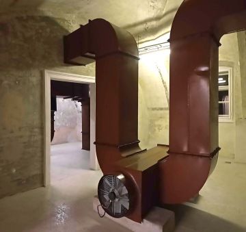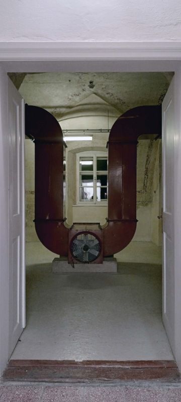 tovární vzduchotechnika, beton, zářivky / factory ventilation system, concrete, fluorescent lights