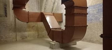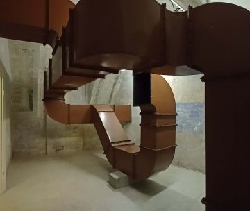 The Nightshift installation is a recycling of heterotopias of decline. These emerged in cities on the sites of former industrial giants built on mechanical labor, whose era ended due to shifts in technology and—specifically in Central Europe—the socio-political system. At the same time, the object functions as a kind of three-dimensional geometric “drawing,” with a line that cuts through the gallery independently of its spatial arrangement.
