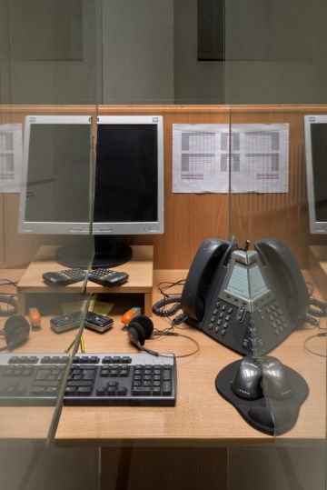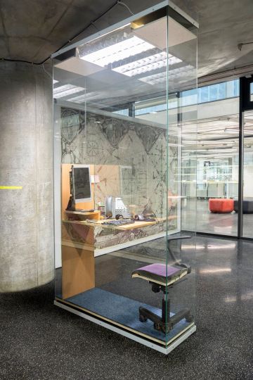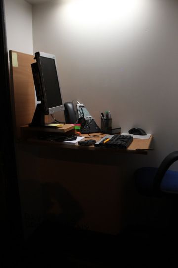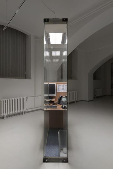 installation, open office workstation in glass box, fluorescent light, 39 × 120 × 230 cm