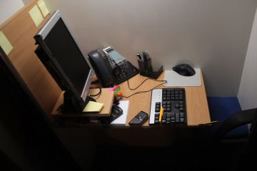 instalace, kancelářský inventář běžného pracovního místa z open space, vitrína, zářivka, 39 × 120 × 230 cm/